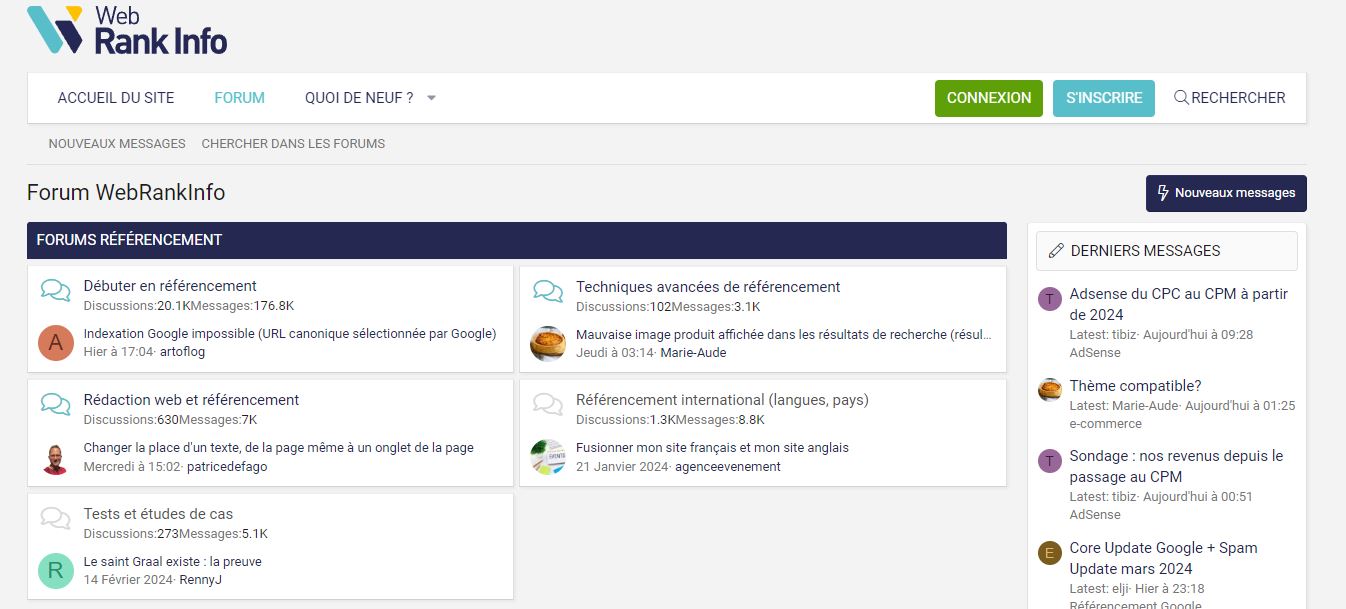 Le forum est adapté pour les webmaster qui veulent faire du SEO et les débutants. On y évoque toutes les problématiques habituelles du référencement : les pénalités, chutes de trafic, problèmes d’indexation, erreurs techniques etc.