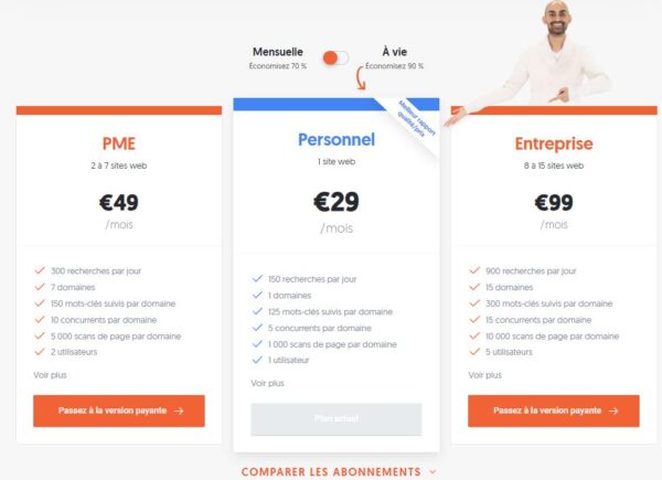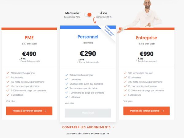 Maintenant la formule la plus intéressante à mon sens est l’achat à vie. Vous achetez la licence à vie au lieu de payer tous les mois. Ce qui est très rentable même à court terme. L’offre de base à vie ne coûte que 290 € et convient très bien pour un indépendant. Et l’offre la plus élevée ne vous coutera que 990 € pour le suivi de 15 sites dans l’outil.