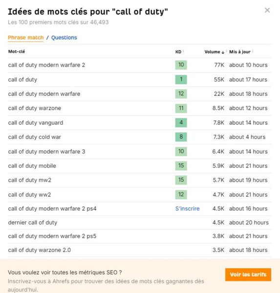 Pour vous faire une idée de la recherche de mots clés sur Ahrefs vous pouvez aller sur la page suivante qui vous permettra de réaliser quelques recherches gratuitement : https://ahrefs.com/fr/keyword-generator/