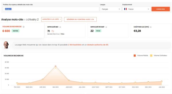 Ce qui est pratique c’est que dans l’onglet « analyse de mots clés » on obtient une saisonnalité sur l’année du mot clé sélectionné. On a bien évidemment les indicateurs habituels : volume de recherche, difficulté SEO, difficulté payant et CPC.