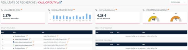 L’analyse des SERP vous permet de voir quels sont les concurrents qui se positionnent sur le mot clé que vous avez choisi. On y retrouve donc le nom du site, l’URL exacte, ainsi que le volume de recherche et la saisonnalité du mot clé.