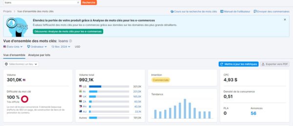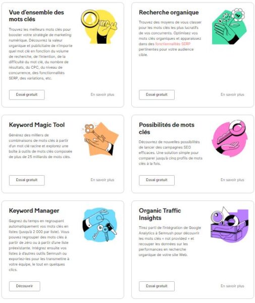 Notez qu’il y a plusieurs offres dans Semrush en plus de la recherche de mots clés, je ne traite ici que de cette partie.