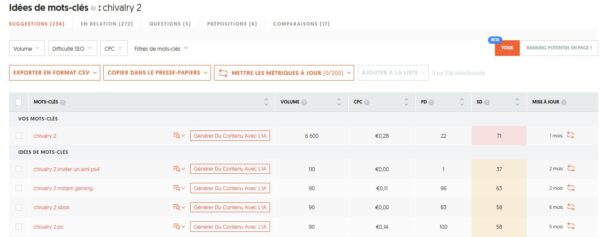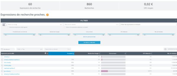 Cette option va vous permettre de déterminer le positionnement probable de votre site sur certains mots clés. En fait l’outil va cibler les mots clés ayant une difficulté moindre. Je trouve cette fonctionnalité intéressante, d’autant que je ne l’ai pas vu sur d’autres outils de recherche de mots clés.