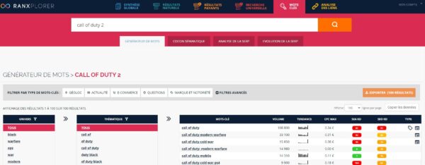Pour accéder à la recherche de mots clés, rendez-vous sur la partie mots clé en rouge du menu du haut. Puis dans le sous-menu cliquez sur générateur de mots. A partir de là il vous suffira d’entrer un mot clé dans la barre de recherche.