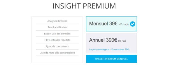 Chez Ranxplorer l’offre de base démarre à 24 € HT/mois ce qui est correcte au vu des fonctionnalités disponibles. Puis chaque offre du dessus vous permet d’avoir plus de data et de faire plus de recherche de mots clés par mois. On notera la possibilité d’utiliser l’API Datastudio pour faire un reporting automatisé dès la 2ème offre à 39.90 €/mois, plutôt sympathique.